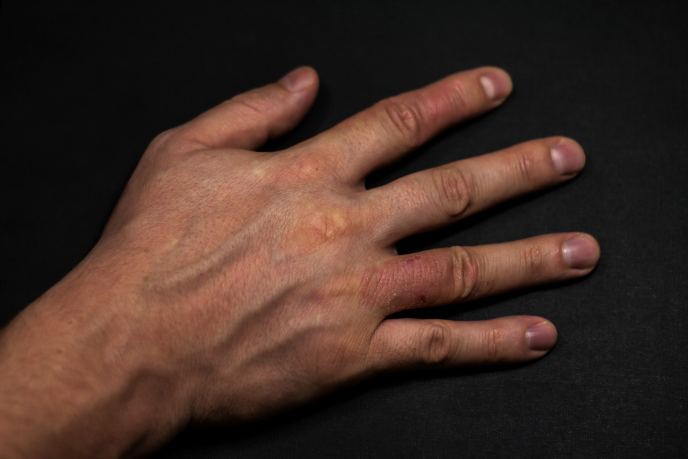 Būdinga, kad oda šioje srityje parausta, atsiranda mažų spuogelių, kurie gali būti uždegiminiai (mazgeliai, arba papulės). Kartais būna ir pūslelių, užpildytų skaidriu arba balzganu skysčiu. Plotas gali būti šiurkštus, sausas, pleiskanojantis, o kai kuriems žmonėms atsiranda niežulys ar deginimo pojūtis.